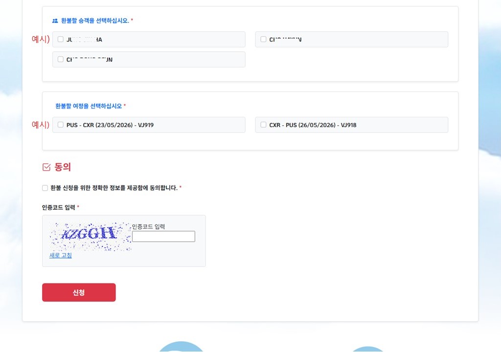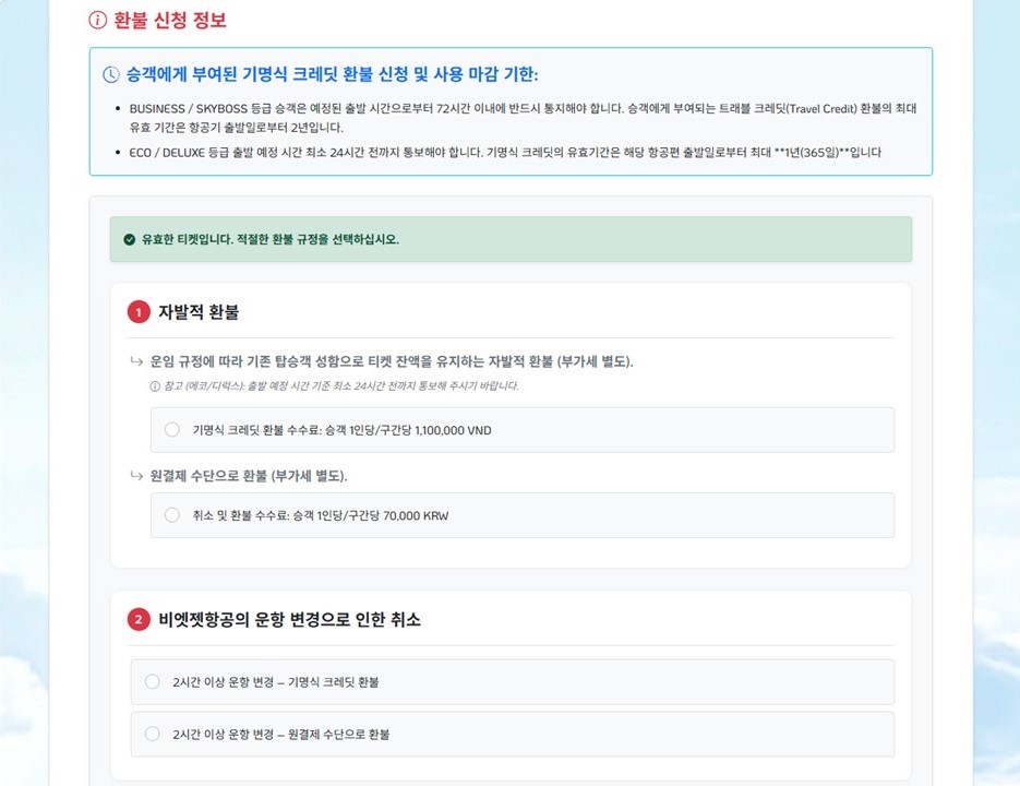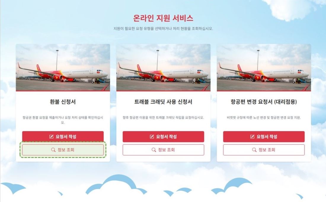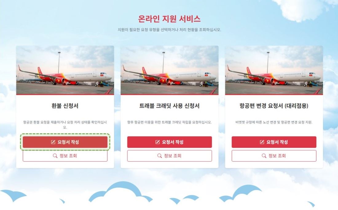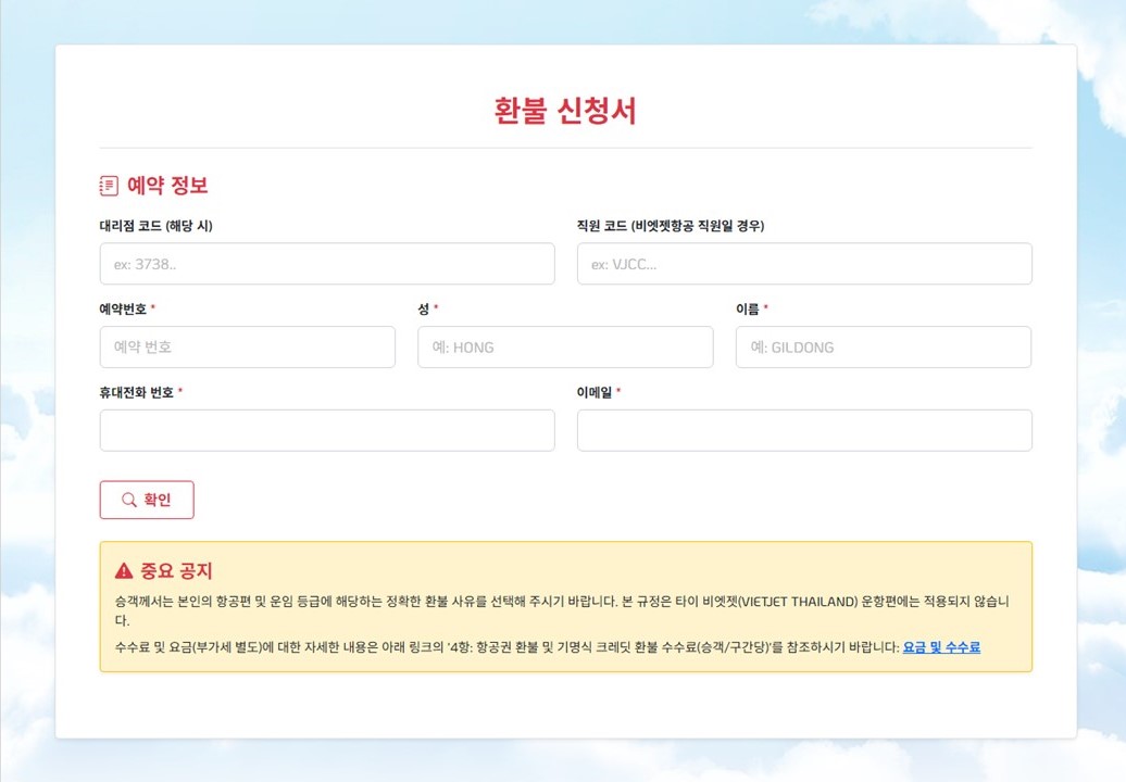 환불 신청 안내 비엣젯항공 공식채널 (홈페이지/모바일 앱)을 통해 구매한 항공권에 한하여, 환불 신청 기한 내에 승객 본인이 직접 환불 신청해 주시기 바랍니다.