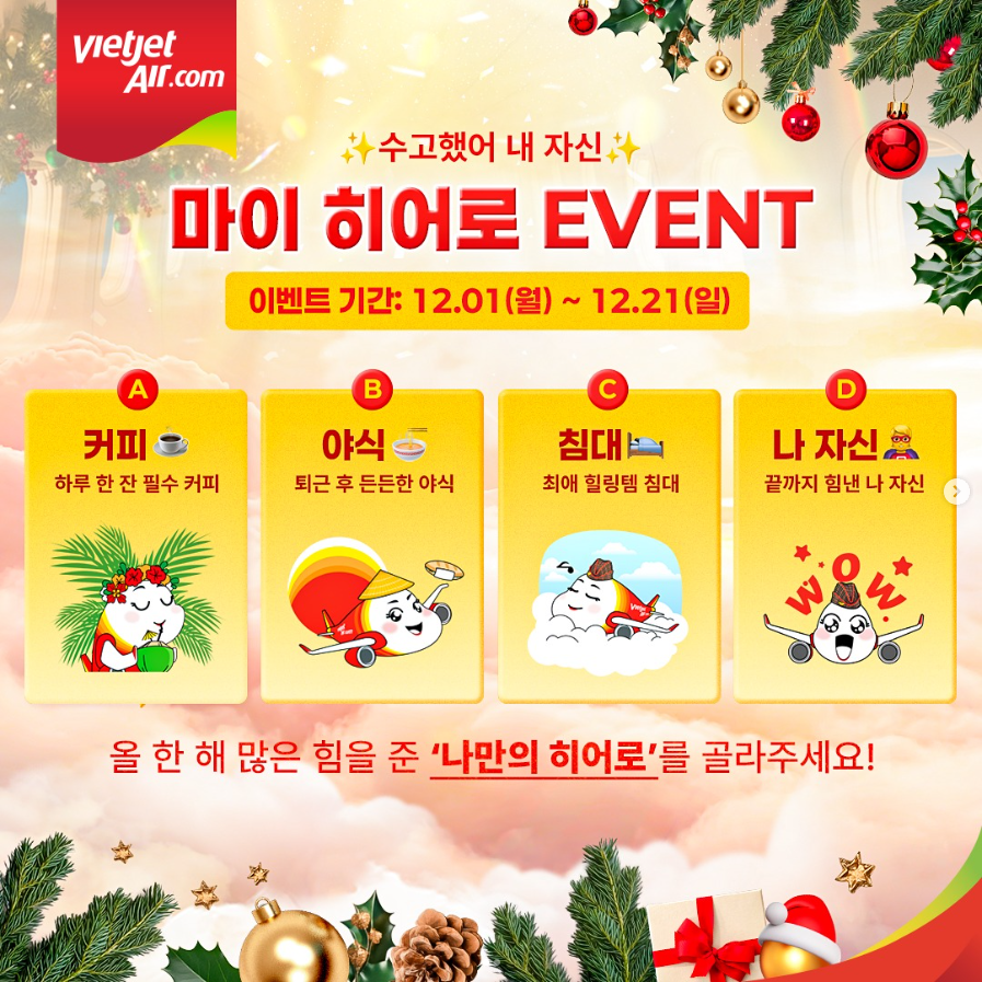 - 당첨자 발표: 12/29(월) 비엣젯 항공 카카오채널에서 당첨자 발표